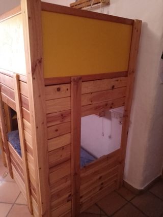 cama litera para niñ@, de madera de pino. creada con mucho mimo, segura y resistente. La venta es por qué se ha quedado pequeña para nuestra hija. La cama original venía acompañada de dos módulos, estantería y cajonera, también se incluyen si los quieren. Esta desmontada por orden. explicamos cómo montarla. negociable.