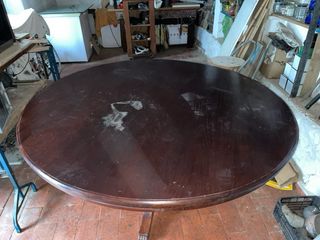 mesa redonda de madera maciza,esta en muy buenas condiciones, el sobre tiene una quemadura que ya venia asi del antiquario