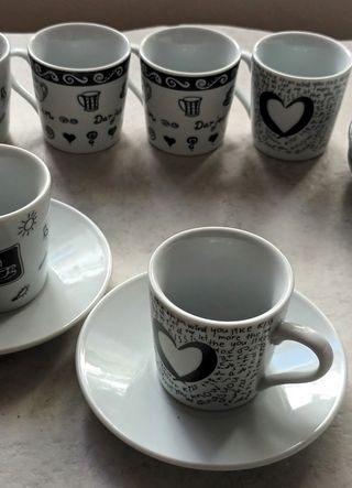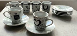Conjunto de taza y platillo de la marca Delta Cafes. - Diseño con el logo de Delta Cafes en rojo. - Fabricado en porcelana.