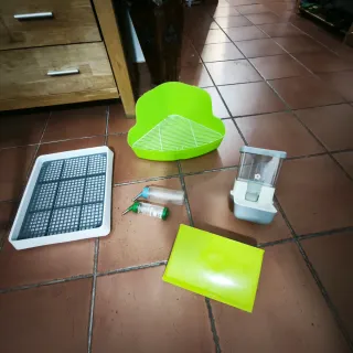 Jaula espaciosa para conejos o animales pequeños, con diseño de dos niveles y materiales combinados. - Estructura de madera y detalles en blanco. - Puertas de rejilla para ventilación. - Ruedas para facilitar el desplazamiento.