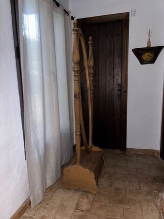 Espejo de pie antiguo de madera – estilo vintage / rústico Descripción: Vendo espejo de pie antiguo de madera maciza, con marco ovalado y columnas torneadas. Estilo clásico/rústico, ideal para dormitorios, recibidores o casas rurales. ✔️ Espejo giratorio (se puede inclinar) ✔️ Base con cajón funcional ✔️ Madera original con pátina antigua ✔️ Estructura sólida y estable El cristal está en buen estado. Medidas aproximadas: Alto: 1,65 cm Ancho: 55 cm Recogida en mano.
