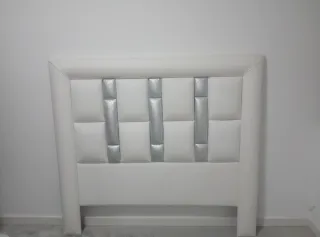 Cabecero de cama con un diseño moderno y elegante. - Tapizado en tela y polipiel. - Combinación de colores blanco y plateado. - Acolchado con detalles cuadrados.