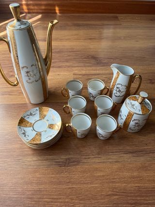 Elegante juego de café con detalles dorados. - tetera - Jarra para leche - Azucarero - 6 tazas -6 platos -Es muy antiguo tiene más de 30 años