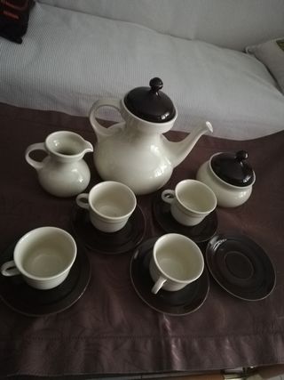 Juego de cafe color crema y marron con 4 tazas de 110ml.de capacidad con 5 platos cafetera de 750ml.de capacidad lechera de 250ml.+azucarero todo 16€