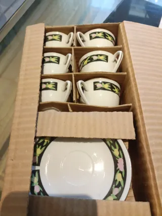 Juego de café de 6 tazas con sus respectivos platos, jarrita para la leche, azucarero y cafetera. Está nuevo, sin usar y tal como se ve en las fotos. Se entregaría en Collado Villalba o centro de Madrid.