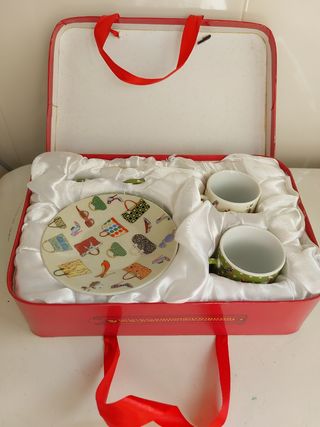 Estuche con un juego de café con 2 tacitas 2 platitos y 2 cucharitas. El estuche es rojo y con aspecto de bolso.Está nuevo, sin usar