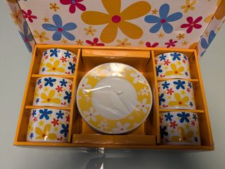 Precioso juego de café de porcelana con diseño de girasoles. Está en perfecto estado y sin usar. - Incluye seis tazitasy seis platos. - El diseño es alegre y colorido. - Ideal para un café especial.