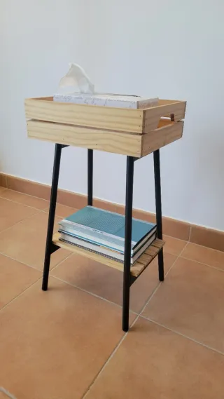 Mesita auxiliar de diseño moderno, combina madera y metal. - Estructura de metal negro. - Tableros de madera. - Dos niveles de almacenaje. -Medidas: 55 cm alto, 30 cm ancho, 25 cm fondo -se vende montada -No se envía
