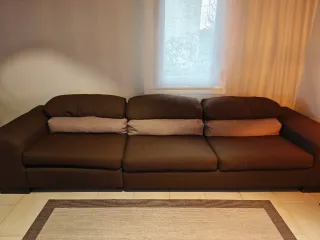 Sofá de tres plazas de la marca Grandfort en un elegante color marrón chocolate. Hay un asiento estropeado con la madera rota de abajo que no influye al sentarse. Se ve completamente bien - Tapicería de tela. - Diseño moderno y confortable.