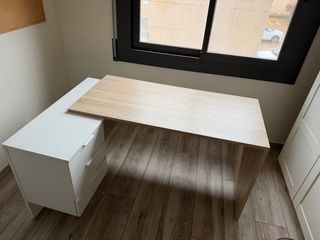 Escritorio con un diseño moderno y funcional, combinando acabados en madera y blanco. - Superficie de trabajo amplia. - Cajonera integrada con tres cajones. - Patas robustas para mayor estabilidad.