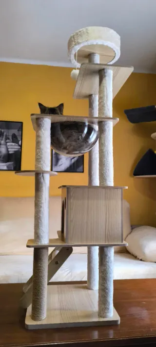 Bonito árbol rascador de madera, con distintas alturas y bases para que tu peludo pueda saltar, trepar, jugar y descansar. Dispone de una casita donde puede dormir sus siestas, una zona tipo claraboya para tumbarse y una cama en la parte más alta desde donde puede observar, jugar o dormir tranquilamente. Está prácticamente sin uso, solo montado, pero no le han hecho caso porque prefieren otros rascadores que tienen por la casa. Puede tener algún pequeño rasguño en alguna de las maderas, se muestra en las fotos. Le falta la claraboya, se partió en un traslado, se puede comprar suelta en AliExpress. Modelos gatunos no incluidos!!