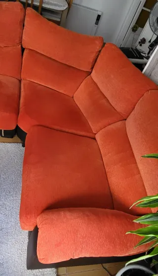 Sofá de 4 plazas de la marca Serrano Confort, combinando tela y piel. - Diseño moderno y confortable. - Tapicería en naranja y marrón oscuro. Se puede dividir en tres piezas para su traslado.