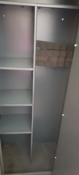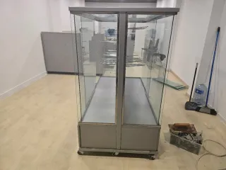 Se vende vitrina expositora de alta calidad, robusta y con acabado premium en gris metalizado. Diseño de doble cara, ideal para islas centrales o separar ambientes en locales comerciales (telefonía, joyería, coleccionismo). Ficha Técnica: Dimensiones: 166 cm (largo) x 86 cm (ancho) x 150 cm (alto). Sistema de Exposición: Doble panel de lamas (Slatwall) para ganchos o estantes. Seguridad: Puertas correderas de cristal templado con cerraduras (llaves incluidas). Almacenamiento: Base con 3 amplios armarios/cajones independientes con cerradura. Movilidad: 6 ruedas industriales reforzadas con freno para fácil desplazamiento. Estad