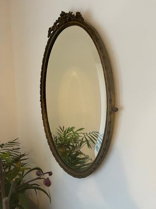 Elegante espejo ovalado con un marco de bronce detallado. Su diseño clásico añade un toque de distinción a cualquier espacio. - Marco con ornamentación. - Forma ovalada.