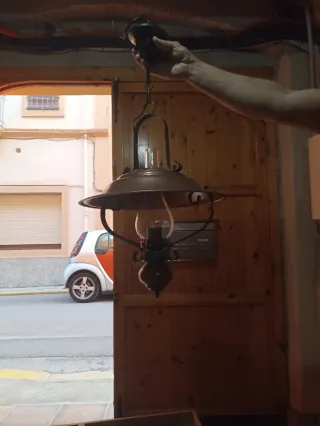 Lámpara de techo con un diseño clásico y elegante. - Combina metal, vidrio y madera. - Tonos marrones y dorados.
