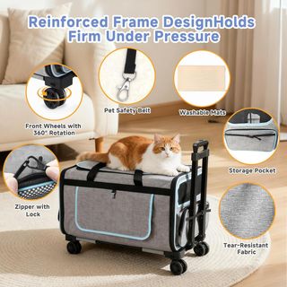 PRECINTADO nuevo a estrenar. Transportín con ruedas para gatos y perros (máx. 20 kg) que combina ventilación y privacidad con doble capa de malla y tela opaca. Marco de acero reforzado, base con almohadilla lavable, cremalleras autobloqueo y clip de seguridad. Correa de hombro ajustable, ruedas 360° desmontables y asa extensible para desplazamientos cómodos. Puertas laterales y superior enrollable facilitan el acceso. Diseño extra grande (65×40×33 cm), plegable y con bolsillos laterales para viajes seguros y prácticos. (svdinshd)