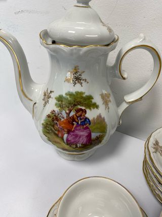 Precioso juego de café antiguo de porcelana. - Diseño con detalles dorados y escenas pintadas. - Incluye tetera, azucarero, lechera, tazas y platos.
