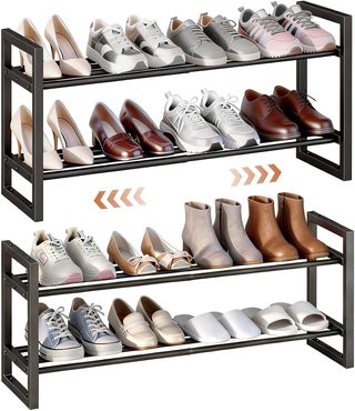 PRECINTADO nuevo a estrenar. Hago envios. Pack de 2 zapateros metálicos extensibles y apilables, ajustables de 45 a 83,5 cm según el espacio. Cada unidad admite de 4 a 8 pares de zapatos y puede combinarse para ganar capacidad. Fabricados en metal resistente, impermeable y fácil de limpiar, con estructura estable de triple tubo (hasta 7kg por estante). Diseño negro moderno, fácil de mover y apto para entrada, armario u otras estancias. (svdinbdrm)