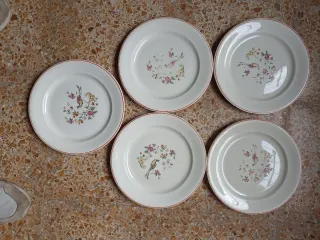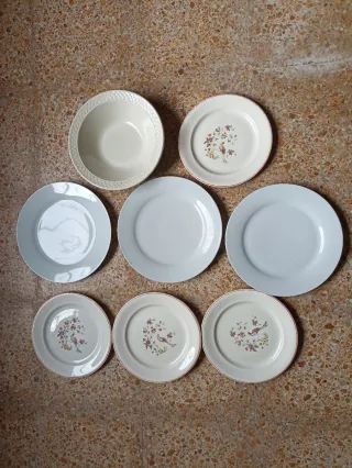 Conjunto de platos de cerámica con un diseño delicado. - Un plato hondo. - Tres platos llanos blancos. - Tres platos con estampado de pájaros y flores.