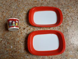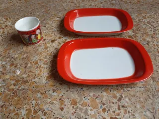 Conjunto de una taza y dos bandejas. - Taza con diseño de amigos. - Bandejas con borde rojo y centro blanco.
