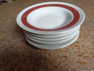 Conjunto de siete platos de porcelana, perfectos para complementar tu vajilla. - Un plato con borde decorado en rojo. - Seis platos blancos lisos.