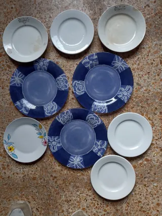 Conjunto de platos de cerámica y porcelana, combinando diseños grandes y pequeños. - Tres platos de cerámica y porcelana. - Diseños variados en tonos azules y blancos. - Incluye platos de diferentes tamaños.