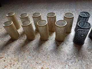 Conjunto de portavelas decorativos con un diseño calado. - Fabricados en metal. - Combinación de colores dorado y negro.