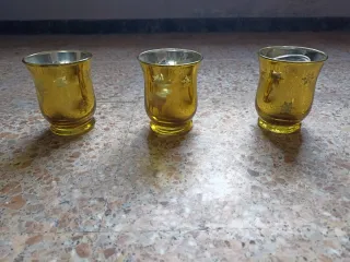 Conjunto de tres portavelas con un bonito diseño. - Color dorado brillante. - Fabricados en cristal. - Decorados con motivos.