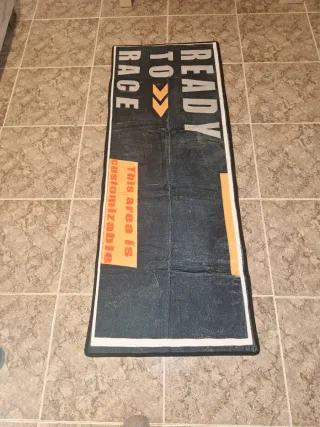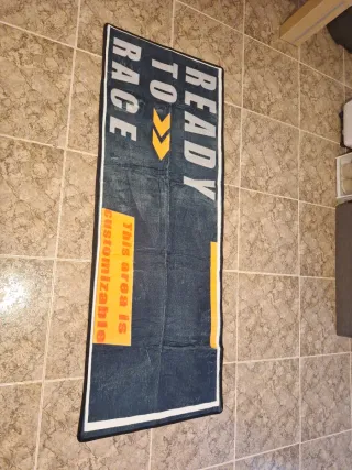 Alfombra con diseño deportivo y un área personalizable. - Diseño Ready to Race. - Zona naranja para personalizar. - Material de tela. -Medidas 1,60 x 60.