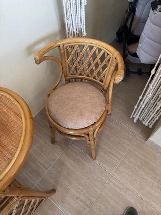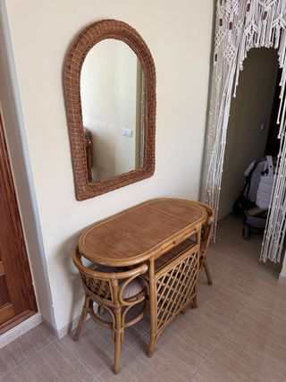 Conjunto de mobiliario de mimbre con un diseño orgánico y natural. - Mesa con superficie ovalada. - Silla a juego. - Espejo con marco de mimbre.