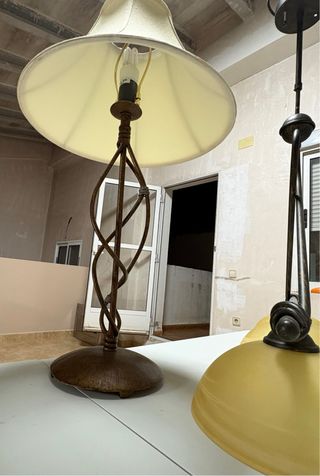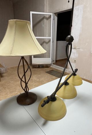 Conjunto de lámparas con un diseño elegante. - Lámpara de mesa con base y estructura de metal con detalles en espiral. - Pantalla de tela en tono claro. - Lámpara colgante con pantalla de cristal amarillo.