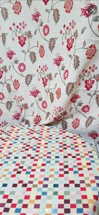 Conjunto de textiles para el hogar con un diseño rústico Cortina con estampado floral en tonos beige y rojos. Cojines y faldillas a juego con un patrón de cuadros multicolor.