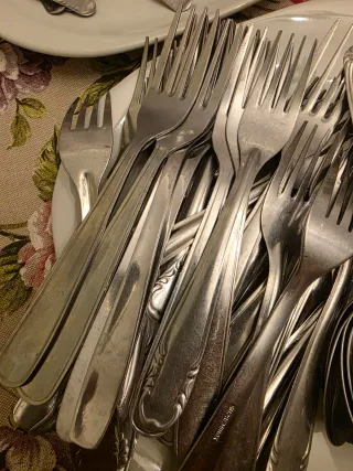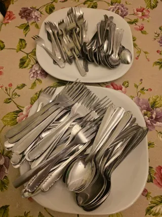Conjunto de cubiertos de metal, perfectos para cualquier ocasión. - Diseño elegante y funcional. - Acabado plateado brillante. - Incluye tenedores y cucharas. 38 tenedores grandes 38 tenedor pequeño 24 cucharas grandes 36 cucharas pequeña
