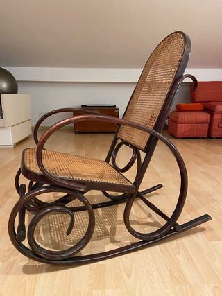 Mecedora antigua con un diseño clásico y elegante. - Estructura de madera curvada. - Asiento y respaldo de ratán tejido.