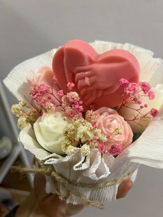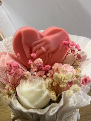 Preciosa vela con forma de corazón y diseño de manos unidas. Ideal como detalle. - Vela con forma de corazón. - Diseño de manos entrelazadas. - Acompañada de flores secas y rosas de cera de soja