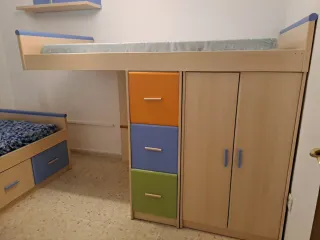 Cama nido con un diseño moderno y funcional, ideal para optimizar el espacio. - Estructura de madera. - Cajones de almacenamiento integrados. - Acabados en azul y naranja.