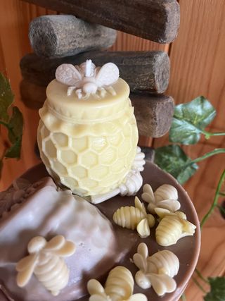 Preciosa vela artesanal con un diseño único. - Forma de colmena con abejas. - Detalles intrincados en relieve. - Acabado en tonos beige y blanco.