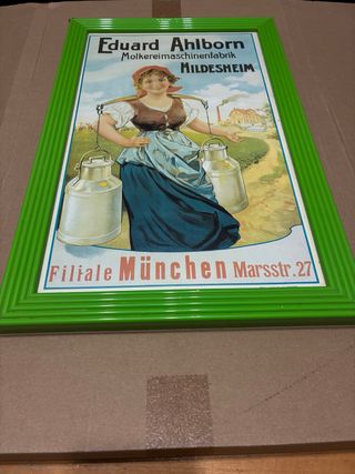 Cartel publicitario antiguo de Eduard Ahlborn. - Representa una lechera con cántaros. - Marco de plástico verde. - Texto en alemán e incluye Filiale München. - Medidas aproximadas: 36 x 48 36 x 50,5 cm 33 x 50,5 Con algunas faltas como se ve en las fotos. 30€ los tres.