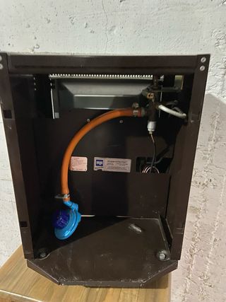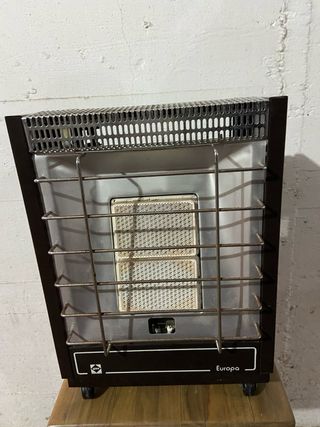 Estufa de gas compacta de la marca Europa. Ideal para calentar espacios pequeños. - Diseño moderno en tonos marrones y plateados. - Fabricada con materiales resistentes de metal y plástico.