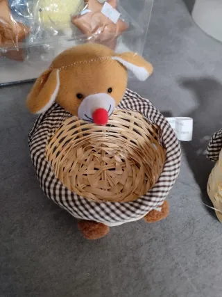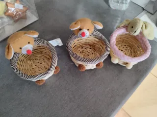 Conjunto de tres cestas decorativas, perfectas para añadir un toque encantador a cualquier espacio. - Diseño con animales de peluche. - Borde interior a cuadros y a rayas rosas. - Patas pequeñas para soporte.