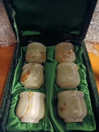 Elegante set de seis vasos tallados en piedra de onix. Cada pieza presenta un diseño único con vetas naturales. - Material: Piedra de onix. - Color: Tonos beige y verdes. - Incluye 6 vasos.