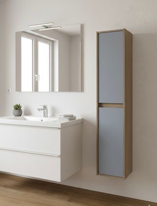 Columna de baño para colgar en la pared o colocar con patas . Diseño moderno con acabados en madera y puertas en azul grisáceo . Como nueva . Medidas 140 cm alto Ancho 30 cm Fondo 26 cm - Ideal para organizar tu baño. - Combina fácilmente con otros muebles.