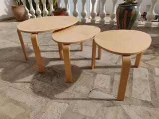 Conjunto de tres mesitas auxiliares con un diseño orgánico y moderno. Son perfectas para complementar tu sala de estar. - Tableros de madera con formas irregulares. - Patas de madera estables.