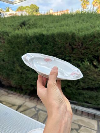 Conjunto de platos hondos de porcelana con un delicado diseño floral. - Diseño octogonal. - Motivos florales en tonos rosas y marrones. - Borde con detalles sutiles.