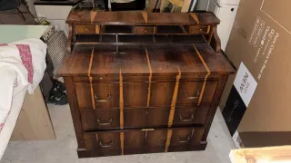 Mueble auxiliar con un diseño de madera veteada en tonos marrones y anaranjados. - Diseño con múltiples cajones y compartimentos. - Tiradores metálicos.