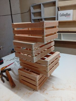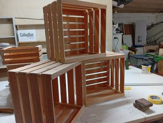 Conjunto de tres cajas de madera, perfectas para almacenamiento o decoración. Tres de 40X40X29, a 37€ cada una Cuatro de 30X20X13, a 23€ cada una. - Fabricadas con madera. - Color marrón natural.