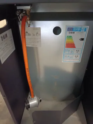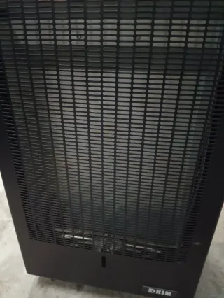 Estufa de metal con un diseño moderno y elegante. - Rejilla frontal para una óptima distribución del calor. - Base estable y segura. - Marca: HJM se vende con botella d gas