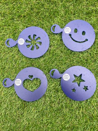 Set de 4 plantillas para decorar tu café con diseños divertidos. Perfectas para Nescafé Dolce Gusto. - Incluye 4 diseños: estrella, corazón, flor y cara sonriente. - Fabricadas en plástico resistente. - Fáciles de usar y limpiar.