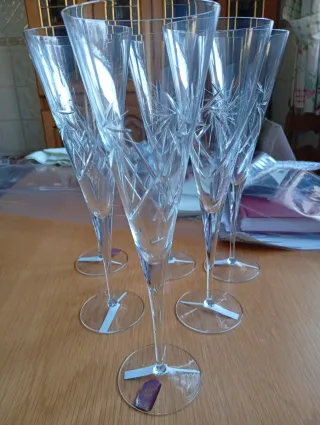 Elegante set de seis copas de cristal tallado con un diseño intrincado y brillante. - Diseño tallado detallado. - Base estable y fina. - Aportan un toque de distinción a cualquier celebración.