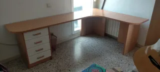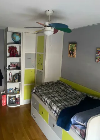 Se vende dormitorio juvenil en buen estado compuesto por armario esquinero, cama de 90x1,90 con dos cajoneras, repisa, estantería de pie y mesa de estudio. Medida armario; largo 1,3 profundo 1,00 alto 2,20. longitud total 3,90 mts. Desmontaje y transporte a cargo del comprador.